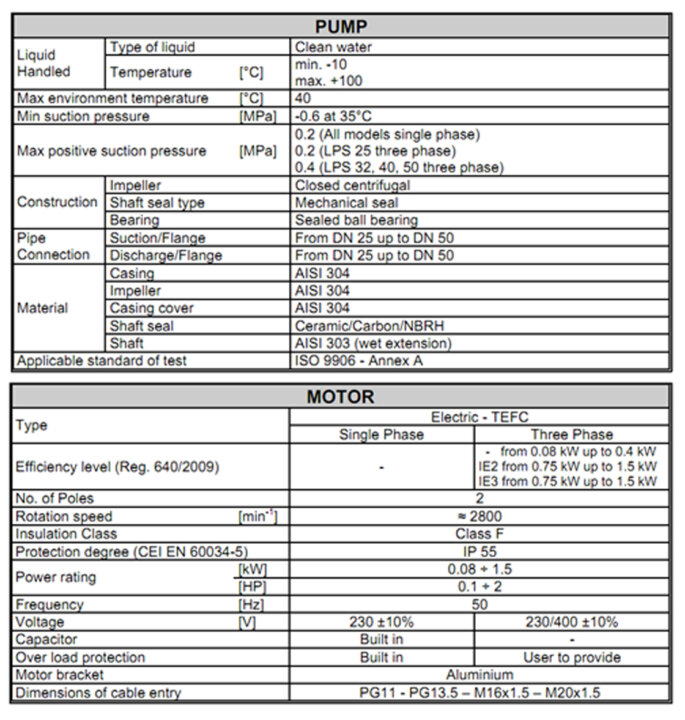 In line centrifugal electric pumps with hydraulic parts in AISI 304 stainless steel
