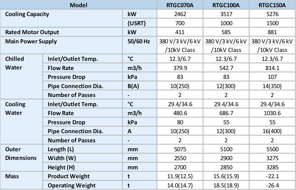 Using Eco-friendly Refrigerant, HFC-134a Cooling Capacity: 1934 to 5627kW{550 to 1600 USRt} COP: 6.0 at AHRI Condition Sixteen standard models with a cooling capacity of 550 to 1600 USRt are available.