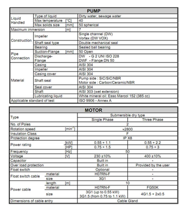 • Submersible electric pumps for sewage in AISI 304 stainless steel